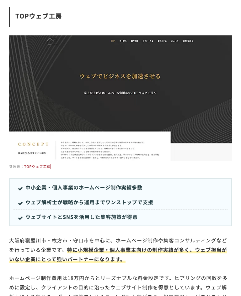 日本最大級の外注先探しサービス「比較ビズ」様の、「大阪府のおすすめホームページ制作会社29選を徹底比較」という記事にて、TOPウェブ工房 【株式会社dob】 が掲載されました。