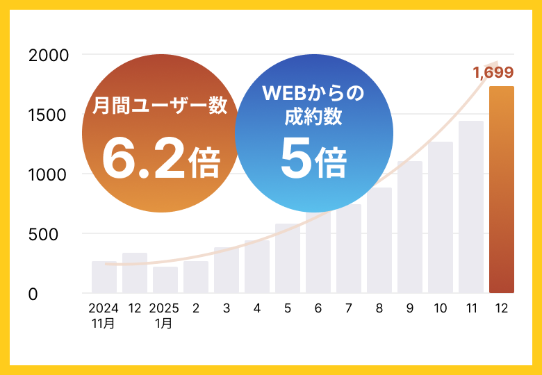 当社の支援実績として、ホームページ作成後、運用開始から1年で「月間ユーザー数6.2倍」、Webからの「成約数5倍」を達成した事例など、確かな成果を創出してきました。
