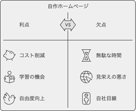 ただ、普段からホームページを作っているからこそわかる「大事なポイント」も沢山あるので、今回はそのポイントに沿い、また自作のメリット・デメリットを交えながら解説していきます。